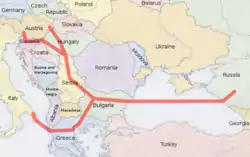 Щодо наземного маршруту, південно-західну гілку планувалося прокласти через Грецію, звідти - через Іонічне море до Італії. Північно-західна гілка за планом мала пройти до Італії з відгалуженням до Австрії. Як транзитні країни розглядалися Румунія, Угорщина і Словенія. Альтернативні маршрути могли пройти через Сербію і Хорватію. В результаті операції між Газпромом і Сербією, в рамках якої Сербія приєдналася до проєкту, а «Газпром» заручився 50%-ми сербської ділянки «Південного потоку»[9], найімовірнішим став другий варіант маршруту. Велика частина морської ділянки проходила б економічною зоною України, частина маршруту - економічною зоною Румунії.