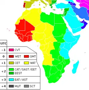 Часові пояси Африки (Смугами відзначені країни, що використовують перехід на літній/зимовий час)