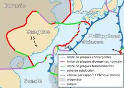 Відокремлена від Китайсько-Корейської платформи палеозойським складчастим поясом хребтом Циньлін; у докембрії, ймовірно, складала разом з нею єдине ціле. Від плити Окінава на сході відокремлена дивергентною границею, що утворює жолоб Окінава й зворотню острівну дугу. На півдні межує з Сундською плитою по розлому Хонгха та плитою Філіппінського моря. Від Євразійської плити на заході відокремлена розломом Лунменьшань.
