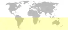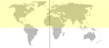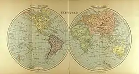 - східну та західну (по Гринвіцькому та 180° меридіанам інколи по меридіану 160° східної і 20° західної довготи за Гринвічем), при цьому у східній півкулі повністю розташована Європа, Африка, Австралія і майже вся Азія, а в західні півкулі — Америка;