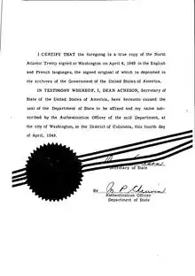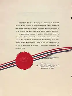 Північноатлантичний договір був підписаний 4 квітня 1949 року у Вашингтоні представниками урядів Бельгії, Великої Британії, Данії, Ісландії, Італії, Канади, Люксембургу, Нідерландів, Норвегії, Португалії, Сполучених Штатів Америки та Французької республіки. Після завершення процесу ратифікації Договору всіма учасниками та депонування відповідних документів у США він набув чинності з 24 серпня 1949 року.