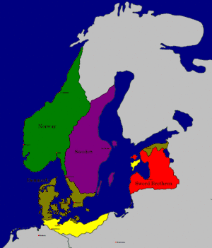 - Ліви, латгали, та ести зазнали вторгнень від німців та данів у 1193–1227 роках. Економічний інтерес німецького купецтва полягав у розширенні своєї присутності у Прибалтиці за рахунок заснування нових міст і католицьких общин у басейні річки Західна Двіна.[5]