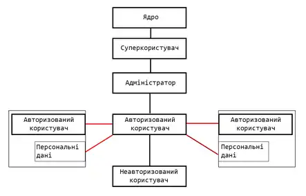 Більшість багатокористувацьких операційних систем мають ієрархію рівнів доступу схожу на наведену нижче (від найменш до найбільш привілейованих):