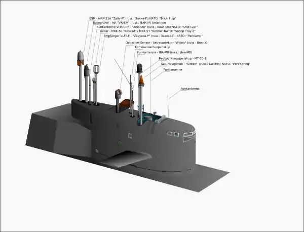 | Ракетне озброєння | 16 шахтних ПУ РБ (комплекс Д-9РМ, ракети Р-29РМ або Р-29РМУ2 «Синева» (договорне позначення РСМ-54, натовське SS-N-23 «Skiff»), ракетно-пусковий комплекс «Водопад» | |
