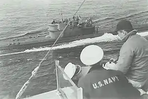 | Капітуляція U-234 типу X американському ескортному міноносцю «Саттон». 14 травня 1945 | ||