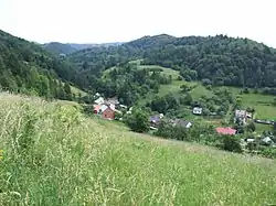 Вигляд зі схилів Мальніка на долину Потоку Підгірського, присілок Міцули та гора Здзяр