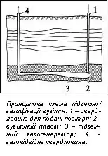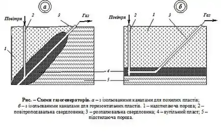 При підземній газифікації відбувається процес термохімічного перетворення вугілля в горючі гази, придатні для енергетичних і технологічних цілей. Крім горючого газу на поверхню видаються такі речовини як феноли, бензоли, піридини, жирні кислоти, сірка та ін. При підземній газифікації отримують в 1,5 — 3 рази більше аміаку, в 1,5 — 10 разів більше піридинових основ ніж при коксуванні. Процес здійснюється в підземних газогенераторах різних типів (рис. а, б). Для горіння вугілля подають повітря або його суміш, збагачену киснем. Збагачення повітря киснем приводить до значного підвищення техніко-економічних показників процесу. При будь-якій схемі необхідно організувати канал газифікації, тобто здійснити збійку двох свердловин. Створення каналу газифікації може здійснюватися такими способами: фільтраційною збійкою, направленим бурінням, гідророзривом пласта, електрозбійкою.