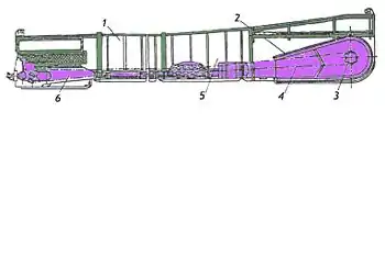 Найбільшого розповсюдження набули скребкові механізовані бункери, які мають просту, міцну і компактну конструкцію. Такий бункер (рис.) складається із акумулюючого жолоба 1, скребкового донного конвейєра 2, механізму пересування і системи автоматизованого керування. Конвеєр, крім робочого органу 4, включає приводну (3), лінійні (5) і кінцеву (6) секції.