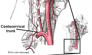 - глибока шийна артерія (лат. a. cervicalis profunda) — вона прямує назад, між першим ребром і поперечним відростком сьомого шийного хребця і кровопостачає глибокі м'язи спини