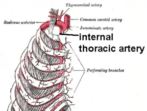 Внутрішня грудна артерія (лат. a. thoracica interna) — відходить від нижньої поверхні підключичної артерії. Вона кровопостачає загрудинну залозу, сполучну тканину верхнього й переднього середостінь, головні бронхи, осердя, пристінкову плевру, грудину, діафрагму, міжреброві та грудні м'язи, прямий м'яз живота, груди. Іде позаду грудинно-ключичного суглоба у верхньому та нижньому середостінні, у передньому середостінні позаду хрящів 1-7 ребер на 2 см зовні від бічного краю грудної кістки, під внутрішньогрудною фасцією. Нижче від хрящя сьомого ребра вона розгалужується на м'язово-діафрагмову та верхню надчеревну артерію. Також від неї відходять наступні гілки:
