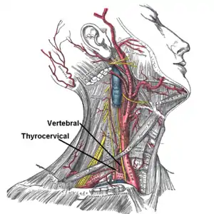- висхідна шийна артерія (лат. a. cervicalis ascendens) — підіймається по драбинчастих м'язах вгору, кровопостачає глибокі м'язи шиї та спинний мозок