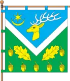 На синьому квадратному полотнищі біла V-подібна смуга шириною в 1/6 ширини прапора, що йде від 1/8 до 1/4 висоти прапора. На верхній синій частині жовта голова оленя з білими рогами, у верхньому древковому куті жовтий горизонтальний півмісяць ріжками догори, над яким жовта шестипроменева зірка. На нижній зеленій частині два жовтих діагональних дубових листки, облямовані сімома жовтими жолудями.