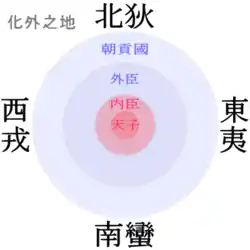В Китаї «Піднебесна» є простором, в якому панує універсальна система китайських цінностей і порядку, котру очолює голова китайської правлячої династії — імператор. Центром «Піднебесної» є «Серединна держава», або, точніше, «Центральна країна» (中国) — цивілізований Китай. Довкола цього центру розташовані країни «чотирьох сторін світу» (四方, див. zh:方国) — варварів Сходу(夷), Півночі (狄), Півдня (蛮) та Заходу (戎). Завданням імператора є зберігання миру у «Піднебесній» шляхом поширення китайської системи цінностей у середовище «варварів». Остаточна мета — тотальна «китаїзація» і розширення кордонів «Центральної країни» до меж існуючого світу. Ця мета розглядається як благо, бо надає «варварським» народам і державам доступ до досягнень китайської цивілізації.