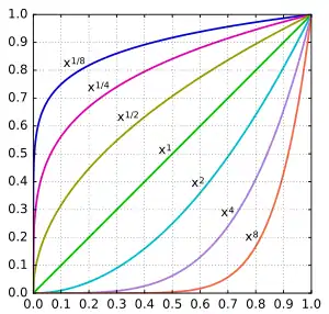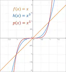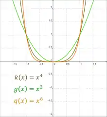 Функції дійсних значень вигляду із називають степеневими функціями. Коли є цілим числом і , існує дві основні різновидності: для парних і непарних . В загальному випадку для , якщо є парним числом із збільшенням буде прямувати до нескінченності із знаком плюс, а також у напрямку нескінченності із знаком плюс при зменшенні . Всі графіки із родини парних степеневих функцій мають загальну форму для , маючи більш плоску форму в середині із збільшенням .[13] Функції із таким видом симетрії () називаються парними функціями.