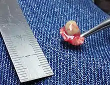 ![]() Підошовна бородавка. Папілярні візерунки обходять область ураження, видно петехії Підошовна бородавка. Папілярні візерунки обходять область ураження, видно петехії | |