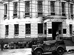 | Своє перебування в Києві, гітлерівці відзначили варварським руйнуванням підприємств, житлових будинків, театрів, клубів, бібліотек, спортивних споруд та ін. Вони підірвали і спалили всі будинки на центральній магістралі міста — Хрещатику та прилеглих до нього вулицях. Від площі Калініна до Бессарабки на місці багатоповерхових споруд залишилися безформні купи заліза та цегли. Руйнування Києва гітлерівці з провокаційною метою приписали діям більшовиків-підпільників.[16] |