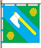 Квадратне полотнище складається з трьох рівновеликих низхідних діагональних смуг зеленого, блакитного і зеленого кольорів. На зелених смугах по одній жовтій соснової шишці. На блакитний смузі біла сокира з жовтим руків'ям.