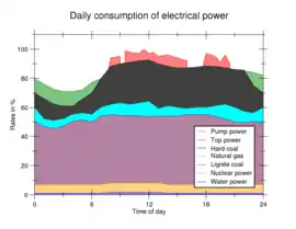 - Електростанції з базовим навантаженням: атомні електростанції, проточні електростанції, вугільні електростанції (у Німеччині для прикладу, електростанції, що працюють на бурому вугіллі, виробляють електроенергію для базового навантаження, а на кам’яному вугіллі – переважно для середнього навантаження) діють цілодобово на повну потужність, наскільки це можливо. Вони можуть виробляти електрику відносно дешево, але регулювати їх можна лише повільно. У разі збоїв таких електростанцій, запасна (резервна) потужність має бути доступною в короткий термін, доки інші електростанції не зможуть взяти на себе виробництво електроенергії. Це не завжди можливо, особливо у разі незапланованих відмов великих енергоблоків.[2]
