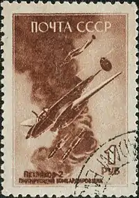 Поштова марка з зображенням радянського пікуючого бомбардувальника Пе-2
