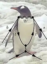 У стилізованій візуалізації діаграми даного процесу, b- та s-кварки нагадують крила пінгвіна, петля — його тулуб, а остання пара частинка-античастинка — його ноги, — що й пояснює популярну назву даних діаграм[⇨].
