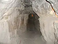 Низхідний коридор, довжиною 105 м іде під нахилом 26° 26'46". Він приводить до горизонтального коридору довжиною 8,90 м, який веде до підземної камери.