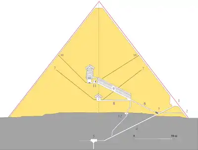 7. Камера цариці з витікаючими «повітроводами» 8. Горизонтальний тунель 9. Велика галерея 10. Камера фараона 11. Передкамера 12. Вертикальна шахта з гротом посередині |