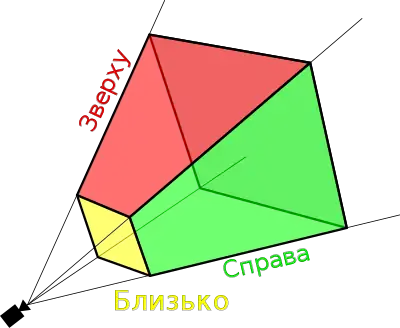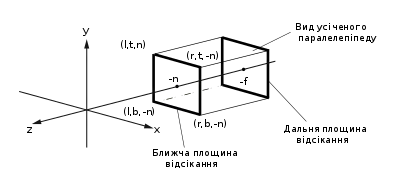 Геометрія визначається кутом поля зору (в напрямку осі «y»), а також співвідношенням сторін. Дві z-площини (вони задаються рівняннями z=const) визначають ближню і дальню межу зрізаної піраміди. Разом ця інформація може бути використана для обчислення проекційної матриці та для рендерингу перетворень у графічному конвеєрі.