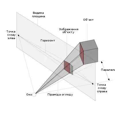 Точна форма цієї області змінюється в залежності від того, який тип об'єктива камери імітується, але зазвичай це зрізана прямокутна піраміда, (звідси і назва). Площини, які розрізають зрізану поверхню перпендикулярно напрямку спостереження, називаються найближчою площиною та найдальшою площиною, відповідно. Об'єкти, які розташовані до камери перед ближчою площиною або далі ніж найдальша площина, не відображаються. Іноді далека площина простягається нескінченно далеко від камери, тому всі об'єкти всередині піраміди огляду, відображаються незалежно від того, на якій вони відстані від камери.