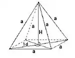де P — периметр, l — апофема, n — число сторін основи, b — бічне ребро, — кут при вершині піраміди - Об'єм піраміди дорівнює одній третій добутку площі її основи S на висоту h: