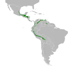 Вид поширений в Центральній і Південній Америці від східної Мексики до Болівії. Мешкає у вологих гірських лісах, хмарних лісах і зрілих вторинних лісах. Трапляється на кавових плантаціях та в сухих лісах.[3][4]
