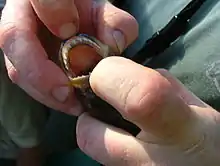 Зуби плоскі, трикутної форми, завдовжки до 5 мм. Зуби на верхній щелепі менші ніж на нижній і при закритому роті заходять у пази між нижніми.