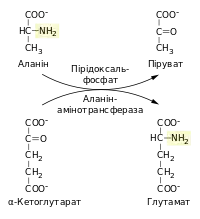 - Аланін — в реакції трансамінування з α-кетоглутаратом, що каталізується аланінамінотрансферазою у мітохондріях;