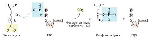 Оскільки оксалоацетат не може транспортуватись через внутрішню мембрану мітохондрій внаслідок відсутності відповідного переносника, він відновлюється до малату, переноситься у цитозоль, де знову окиснюється. На оксалоацетат діє фермент фосфоенолпіруваткарбоксикіназа, що перетворює його у фосфоенолпіруват, використовуючи для цього фосфатну групу ГТФ: