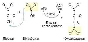 Ацетил-кофермент А одночасно діє як позитивний алостеричний модулятор для піруваткарбоксилази, яка каталізує перетворення пірувату до оксалоацетату із гідролізом однієї молекули АТФ: