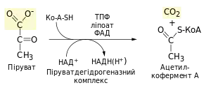Окисне декарбоксилювання пірувату здійснюється піруватдегідрогеназним мультиензимним комлпексом, до складу якого входять три різні ферменти та п'ять коферментів. В цій реакції від молекули пірувату відщеплюється карбоксильна група у формі CO2, утворений залишок оцтової кислоти переноситься на кофермент А, також відновлюється одна молекула НАД: