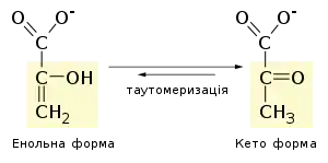Піровиноградна кислота може існувати у формі двох таутомерів енольного та кето, перетворення яких одне в одного легко відбувається без участі ферментів. При pH середовища 7 переважає кетонна форма.