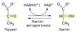 В еукаріотичних клітинах за анаеробних умов (наприклад в дуже активних скелетних м'язах, занурених у воду рослинних тканинах та со́лідних пухлинах), а також в молочнокислих бактерій, відбувається процес молочнокислого бродіння, за якого піруват є кінцевим акцептором електронів. Приймаючи пару електронів та протонів від НАДH піровиноградна кислота відновлюється до молочної, каталізує реакцію лактатдегідрогеназа (ΔG0=-25,1 кДж/моль).