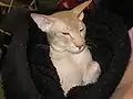 Голова клиноподібна, вузька. Морда сильна, не гостра. Лоб і щоки пласкі. На лобі вертикальні складки шкіри, які, ніби віяло, розходяться над очима. Підборіддя на одній лінії з кінчиком носа. Лінія профілю пряма. Вуха неширокі в основі, великі, трохи розведені в боки. Вій немає. Очі мигдалеподібні, косо поставлені. Мають зелений або блакитний колір.