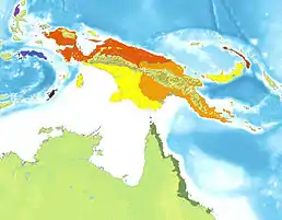 ![]() Поширення аметистового пітона (окреслено червоним, жовтим та помаранчевим; різні кольори — різні форми забарвлення) | ||||||||||||||||||||||