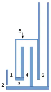 Конструкція (на рисунку) включає ємність для завантаження палива (1), піддувало (2), камеру згоряння (3), камеру допалювання (4), теплообмінник (5) димар (6). Дрова закладаються в ємність (1) зверху і просуваються донизу при вигоранні. Повітря в піч надходить через відкритий зверху отвір для закладання палива та через піддувало (2), яке також дозволяє вибирати попіл. Горіння відбувається в камері згоряння (3), а в термоізольованій камері (4) відбувається високотемпературне допалювання. Обігрів приміщення забезпечується через теплообмінник (5), витяжна труба (6) забезпечує необхідну тягу.