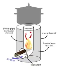 Конструкція (на рисунку) включає горизонтальну, похилу або вертикальну ємність для закладання палива та термоізольовану камеру допалювання, яка одночасно є витяжною трубою. Приготування їжі відбувається безпосередньо над витяжною трубою.