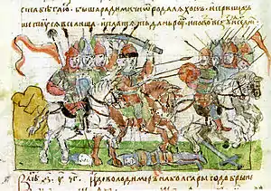 Мініатюра Радзивіллівського літопису: перемога Вовчого Хвоста, воєводи київського князя Володимира Святославича, над радимичами на річці Піщані в 984