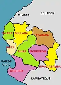Межує на півдні — з Еквадором і з регіоном Ламбаєке, на півночі з регіоном Тумбес, на сході з регіоном Кахамарка, на заході з Тихим океаном, розташований тут мис Паріньяс — найзахідніша точка Південної Америки.