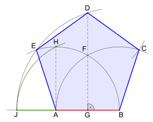 Відповідно до закону золотого перетину, і застосовуючи ділення відрізку за допомогою зовнішнього поділу п'ятикутник можна побудувати за допомогою наступних кроків: