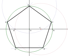 - Намалюємо коло із радіусом OA і з центром в точці W. Воно перетинає початкове коло у двох вершинах п'ятикутника.