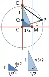 Визначимо довжину цієї побудованої сторони. Два правильні трикутники DCM і QCM показані внизу під колом. Використовуючи теорему Піфагора і дві сторони, гіпотенузу більшого трикутника можна знайти наступним чином . Сторону h меншого трикутника тоді можна знайти за допомогою формули половинного кута: