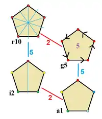 Ці 4 типи симетрії у п'ятикутнику можна побачити у вигляді 4 різних симетрій. Джон Конвей позначав їх за допомогою літери і порядку групи.[6] Повна симетрія правильної форми — r10 і не існує симетрії із підписом a1. Діедральні симетрії поділяються в залежності від того, чи вони проходять через вершини (d для діагоналі) або ребра (p для перпендикулярів), і i коли лінії відбиття проходять через вершини і ребра одночасно. Обертові симетрії позначені літерою g відповідно до їх порядку центрального обертання.