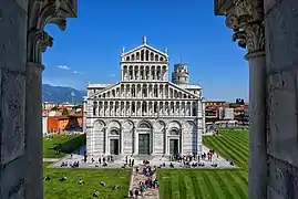 На відміну від загальної традиції, Соборна площа в Пізі знаходиться не посередині історичного центру міста, а за межами міських середньовічних стін, з північно-західної сторони міста. Вибір місця для нового собору походив як від необхідності розширення старого ранньосередньовічного міста, що було занадто мале, щоб вмістити в себе новий грандіозний за розмірами архітектурний ансамбль, так і з метою продемонструвати військову потугу і впевненість в собі молодої морської республіки, що не боялась розмістити свій головний собор і усі його скарби за межами міських мурів. Крім того, вважається що саме на цьому місці була розташована попередня церква, присвячена Санта-Марії.