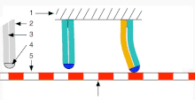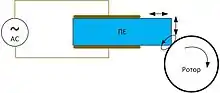 На «гнучкий» статор (тонка біморфна пластина, чим тонша пластина, тим більше амплітуда коливань і тим нижче частота резонансу) «подають» змінну напругу високої частоти , яке змушує його виробляти ультразвукові коливання, що формують механічну біжучу хвилю, яка і штовхає (зачіпляє) розташований поруч ротор. Під час руху ліворуч, штовхач - розклинює, а у разі руху праворуч - заклинює. На цьому принципі працюють усі п'єзоелектричні мотори зі штовхачами. Збільшуючи число штовхачів можна створювати мотори з величезними пусковими моментами.