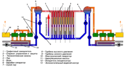 Цей реактор — канальний, гетерогенний, уран-графітовий (графіто-водний за сповільнювачем), киплячого типу, на теплових нейтронах; призначений для вироблення пари тиском 70 кгс/см². Теплоносій — кипляча вода.